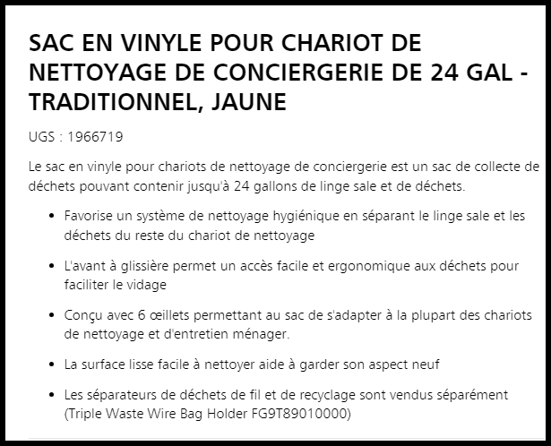 Le sac en vinyle pour chariots de nettoyage de conciergerie est un sac de collecte des déchets pouvant contenir jusqu'à 24 gallons de linge souillé et de déchets.